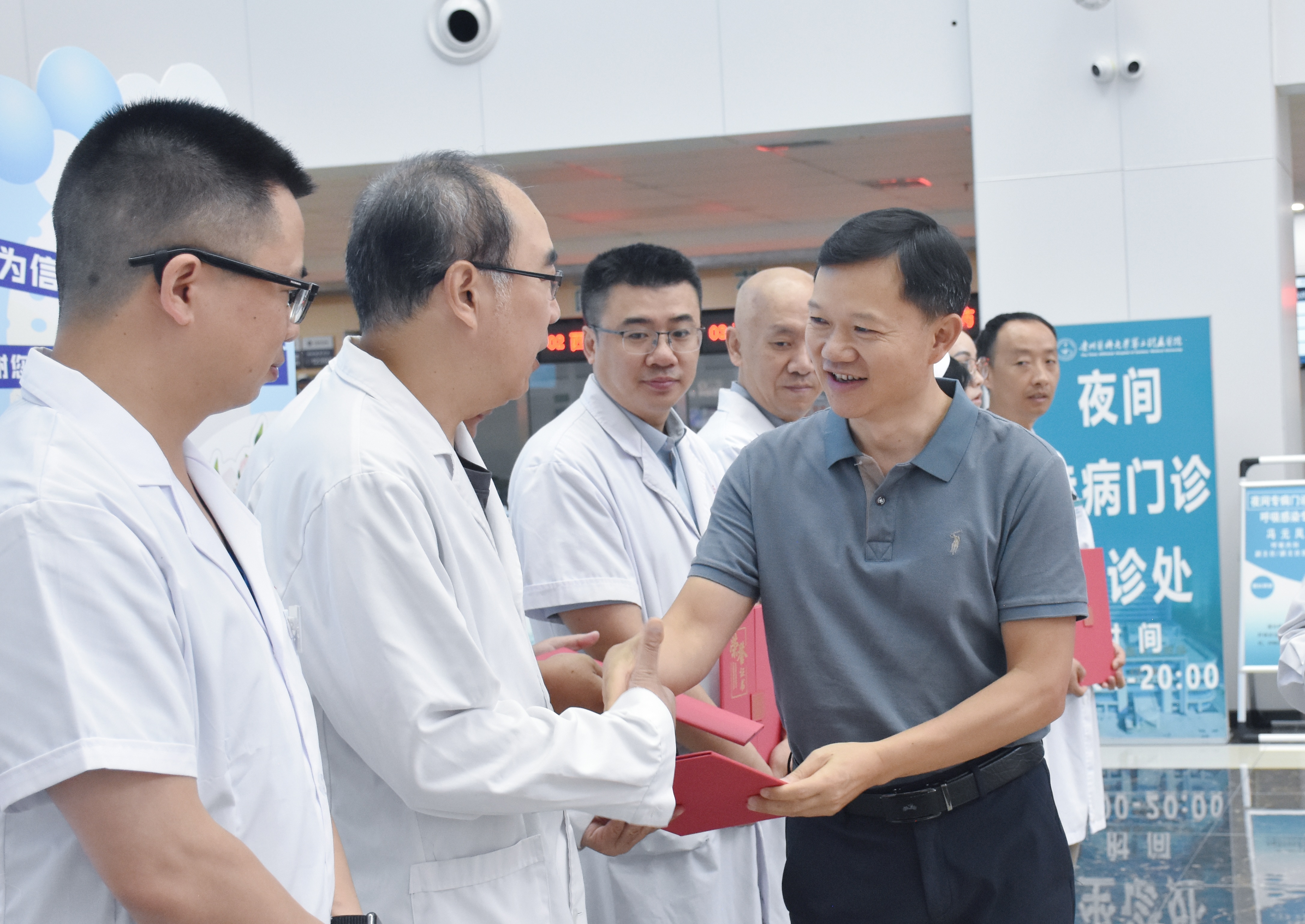 8月19日,在第八个中国医师节当天,黔南州卫生健康局党委书记王明佐一行来到我院,慰问了无偿献血10次以上的医务人员代表。我院党委书记姚辉、党委副书记杨胜华陪同慰问。