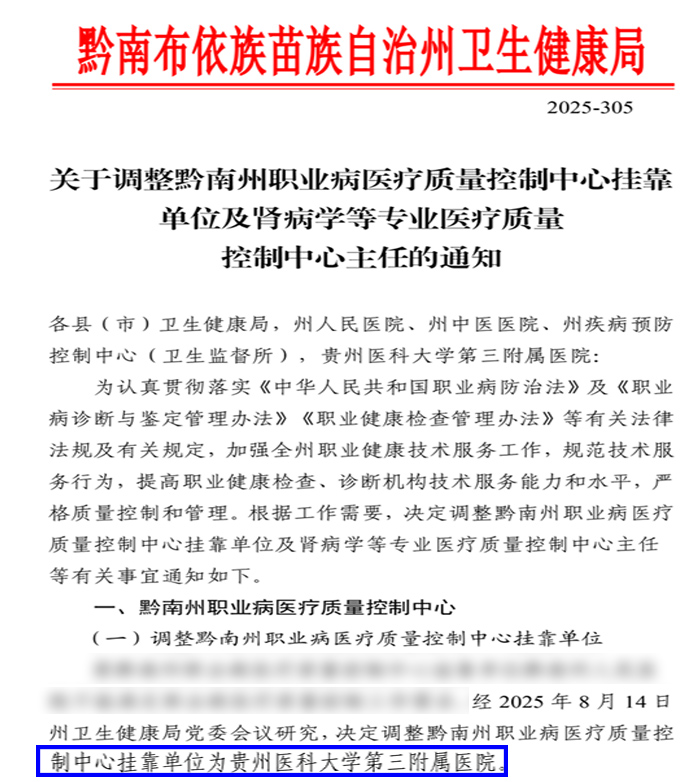 近期,黔南州卫生健康局下发了通知,决定将黔南州职业病医疗质量控制中心挂靠单位调整为贵州医科大学第三附属医院。