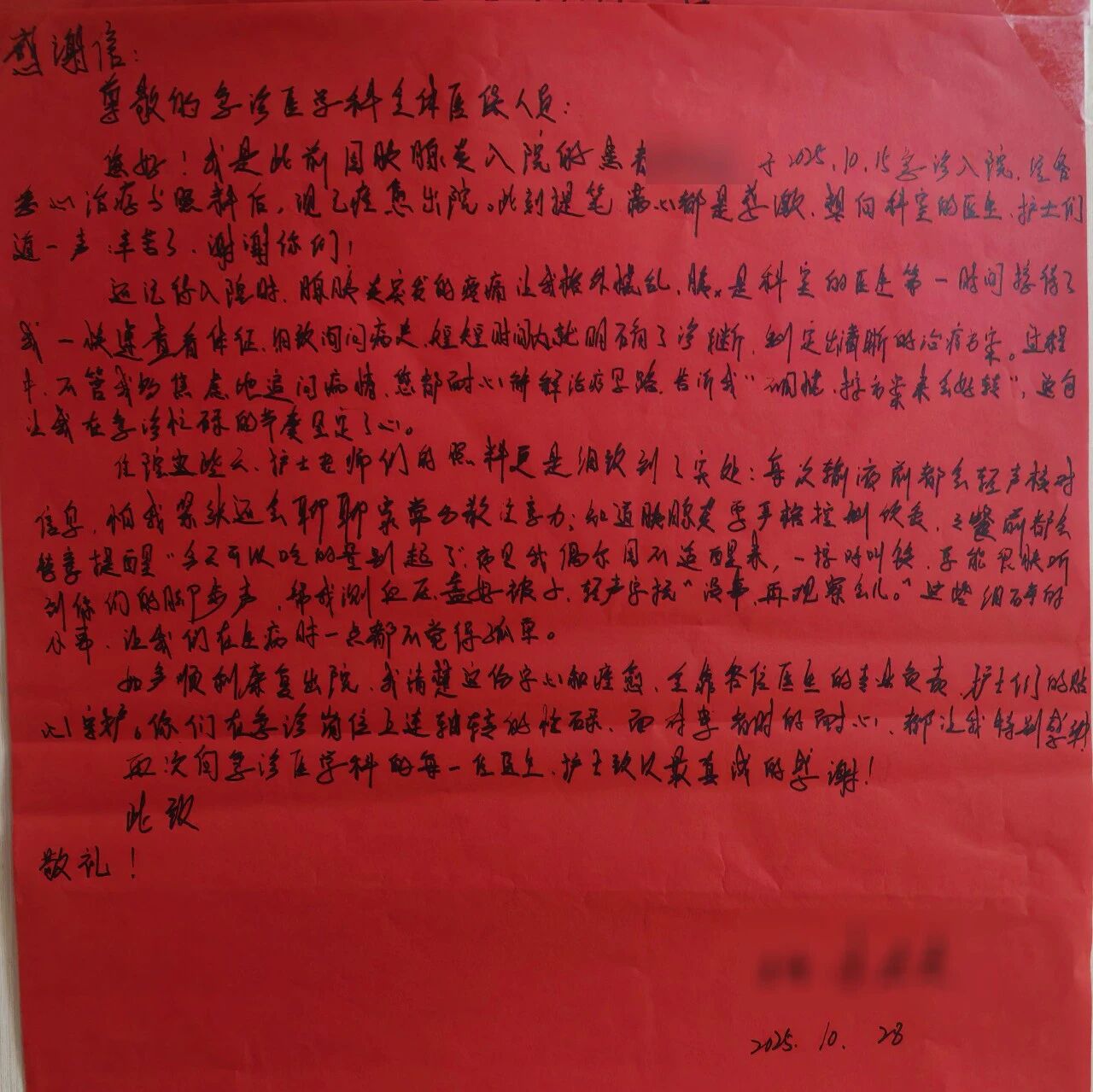 近日,我院急诊医学科内暖意涌动,科室接连收到多位患者送来的手写感谢信。这些不仅是患者对急诊医护人员专业救治能力的高度认可,更生动映照出医患之间双向奔赴的信任与温情。