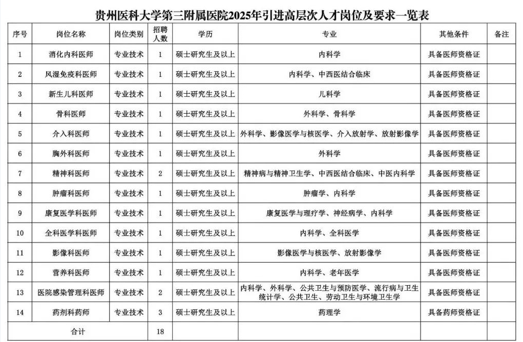 2月14日,贵州医科大学第三附属医院发布消息称,根据工作需要,该院现面向社会公开引进编外合同制高层次人才18名。