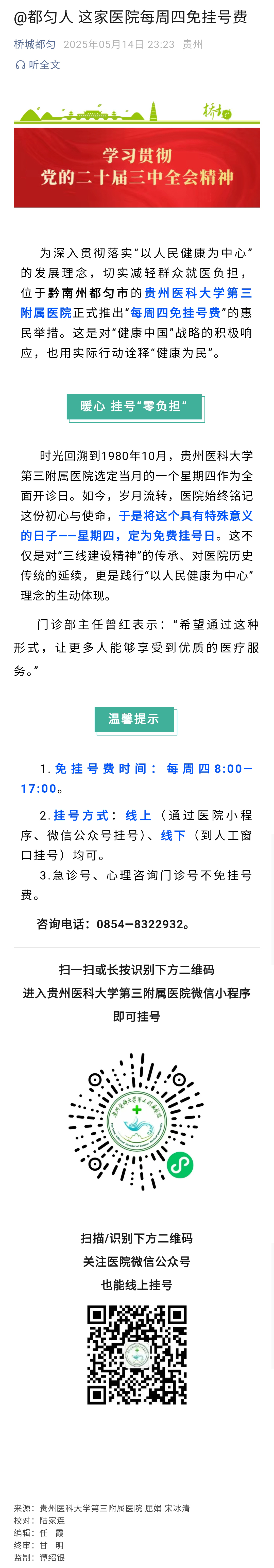桥城都匀|@都匀人 这家医院每周四免挂号费