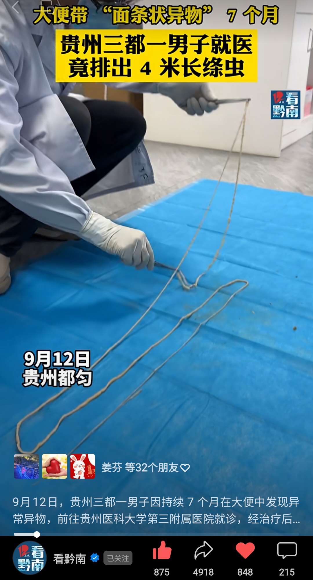 9月12日,贵州三都一男子因持续 7 个月在大便中发现异常异物,前往贵州医科大学第三附属医院就诊,经治疗后成功排出一条长达 4 米多的绦虫